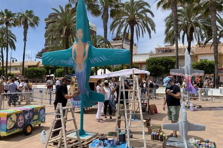 Ocho reconocidos artistas urbanos imprimieron su sello en otras tantas réplicas de grandes dimensiones del avión C-101 en la primera edición del Festival de Arte Callejero Aeronáutico(FACA) que se celebró este domingo en Santiago de la Ribera. Goyo y Nort, oriundos de San Javier, y otros creativos procedentes de diferentes puntos de España como Tom Rock, Kraser, Clara Ledo, Villy Arenas y El niño de las pinturas, intervinieron las maquetas en blanco para vestir de estética urbana las...