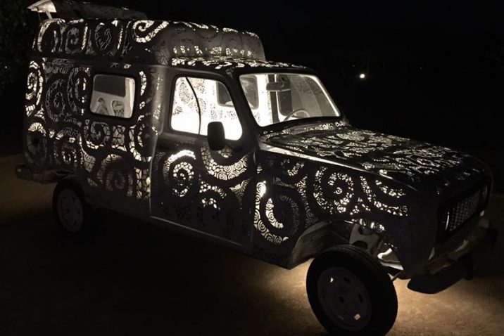 El Renault 4 laboriosamente troquelado que formó parte de la reciente exposición del creativo Miguel Canseco en la galería La Aurora se ha quedado en la Región. Ahora forma parte del peculiar paisaje del espacio Finca San Antonio, cerca de Alcantarilla, que dirige el interiorista y diseñador Paco Martínez Almagro.