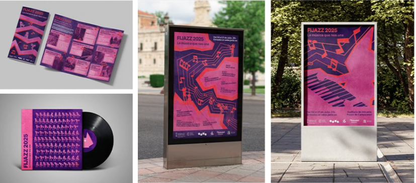 La última selección del concurso, esta vez en la categoría de diseño de evento, la conquista Jorge Vidal por Fijazz 2025, propuesta de rediseño para un festival anual de jazz en Alicante. “La nueva identidad visual del festival apuesta por una marca dinámica y estrechamente ligada a su música”, argumenta Vidal.