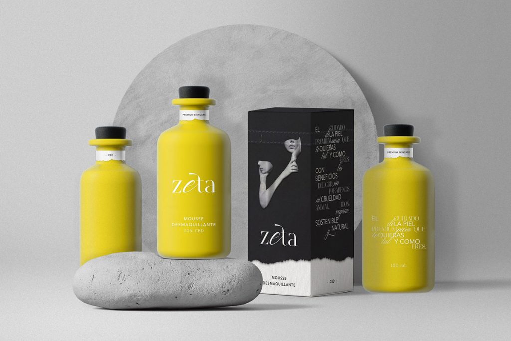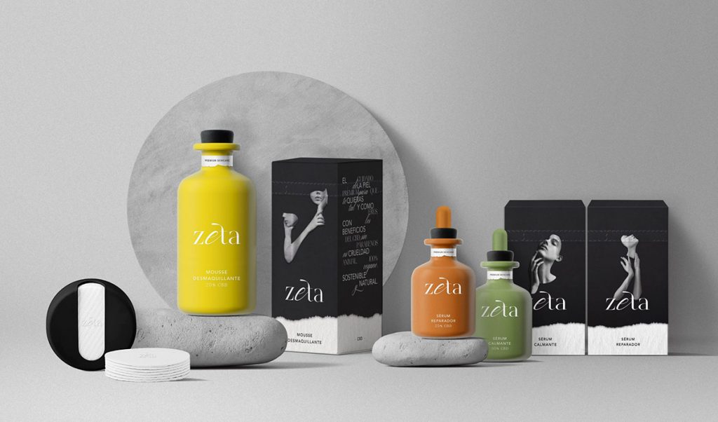 La tercera propuesta de Vanesa García distinguida con selección Arcapack es para Zeta, una marca Premium de cosmética para el cuidado de la piel con base de cannabidiol (CBD) CBD. El packaging principal es de porcelana mate serigrafiada a una tinta y las cajas secundarias son de cartón. La abertura a partir de una tira troquelada rasgable, implica romper la caja y parte del key visual, un guiño al concepto de la marca.