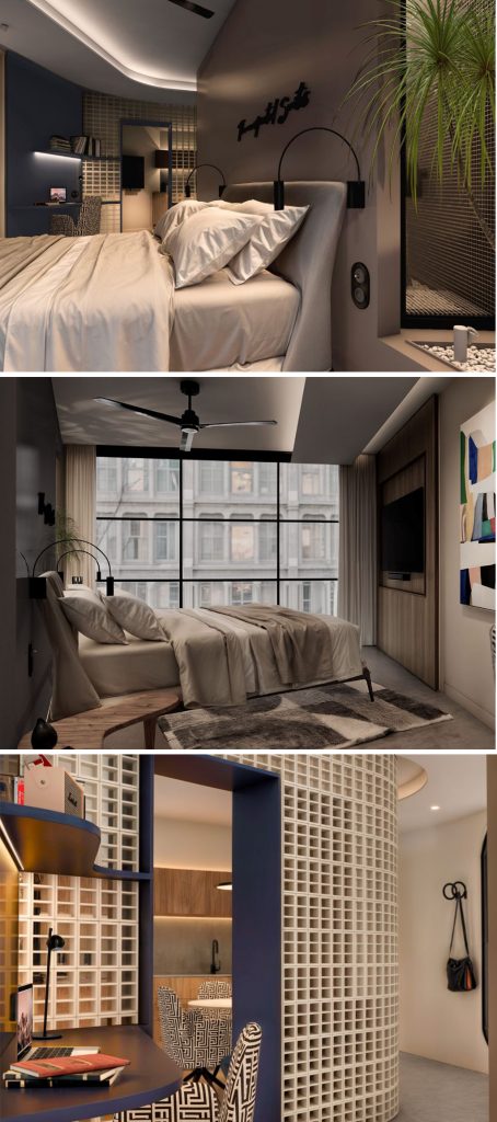 El segundo accésit ha sido para La invitación, de Tocho Studio, formado en Madrid por Rodrigo de la Torre, Lucía García y Diego García. “Un proyecto que replantea la idea tradicional de la habitación de hotel. Se trata de una habitación que no solo aloja al usuario sino que lo invita a habitar, explorar y transformar su estancia en una experiencia personal y creativa”.