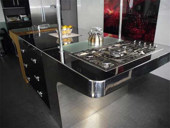 La zona de trabajo se ha construido con un flap procedente del ala de un avión, complementado con asientos de piloto. La mesa con cristal giratorio se apoya en una hélice, mientras que la cocina tiene también claras connotaciones aeronáuticas, recordando las dos puntas de la cola de una aeronave.