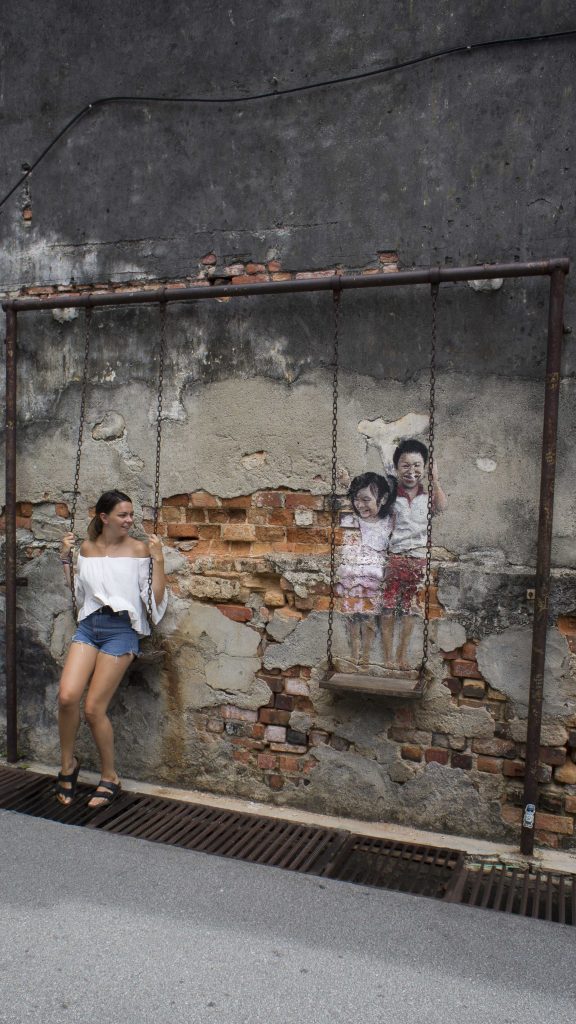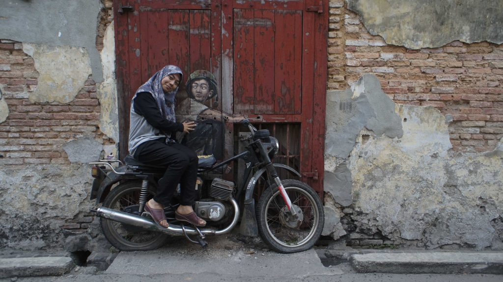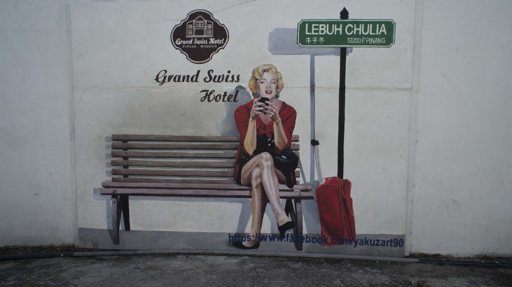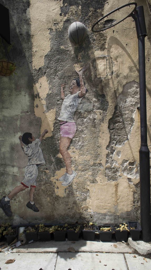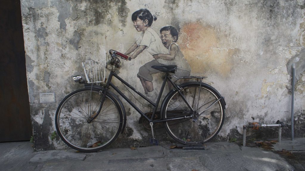 Me fue simpática e interesante la idea del grafitero de tentar al público a sumarse a su obra. El autor de este proyecto de street art fue el artista lituano Zach (Ernest Zacharevic, 1986), basado en Penang, y lo realizó en 2012. Lo llamó Mirrors George Tow y se componía originalmente de seis murales. Cinco años después, algunas de sus obras estaban ya algo deterioradas por el salitre del mar y otros “espontáneos” se habían sumado a su proyecto original, regando la ciudad de numerosos grafitis. No sabría decir cuántos hay ahora ni en qué estado están. Pero esto es lo que había, más o menos, en aquel tiempo”.