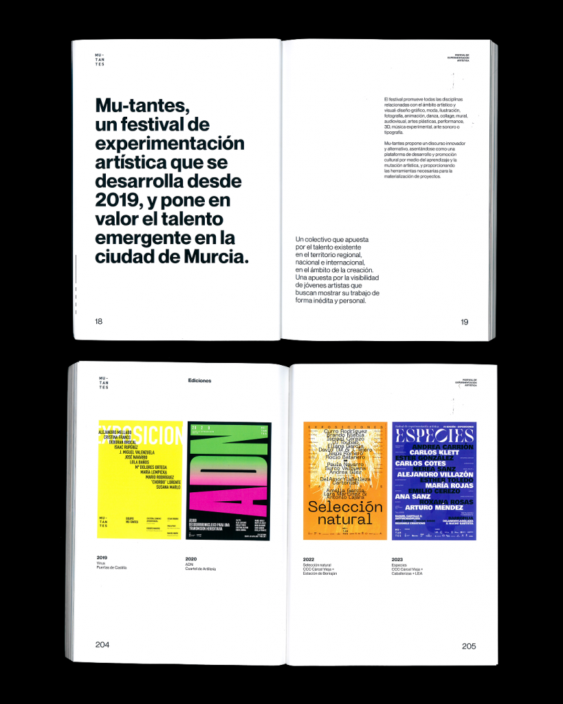 El periodo de reflexión autoimpuesto en 2024, no obstante, ha dado como resultado Mu-tantes/Festival de experimentación artística, el primer libro editado por el festival y publicado con el apoyo del Ayuntamiento de Murcia. El volumen está disponible para su consulta y disfrute en Biblioteca y el Archivo Regional, así como en los centros culturales del municipio de Murcia