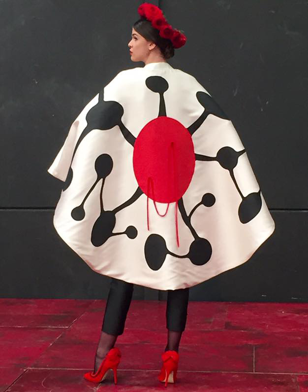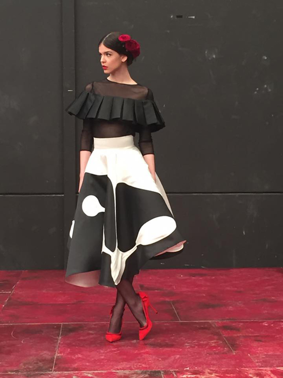 ”El negro no es ni ambiguo ni inocente, es un color que aporta intenciones, que desafía, que abraza la melancolía, pero a la vez elegante y misterioso”, ha explicado Dolores Nicolás. La diseñadora, en colaboración con el artista multidisciplinar Ángel Haro, también radicado en Murcia, ha creado en blanco y negro cuatro capas y una falda capa con las figuras bordadas originales del creativo.